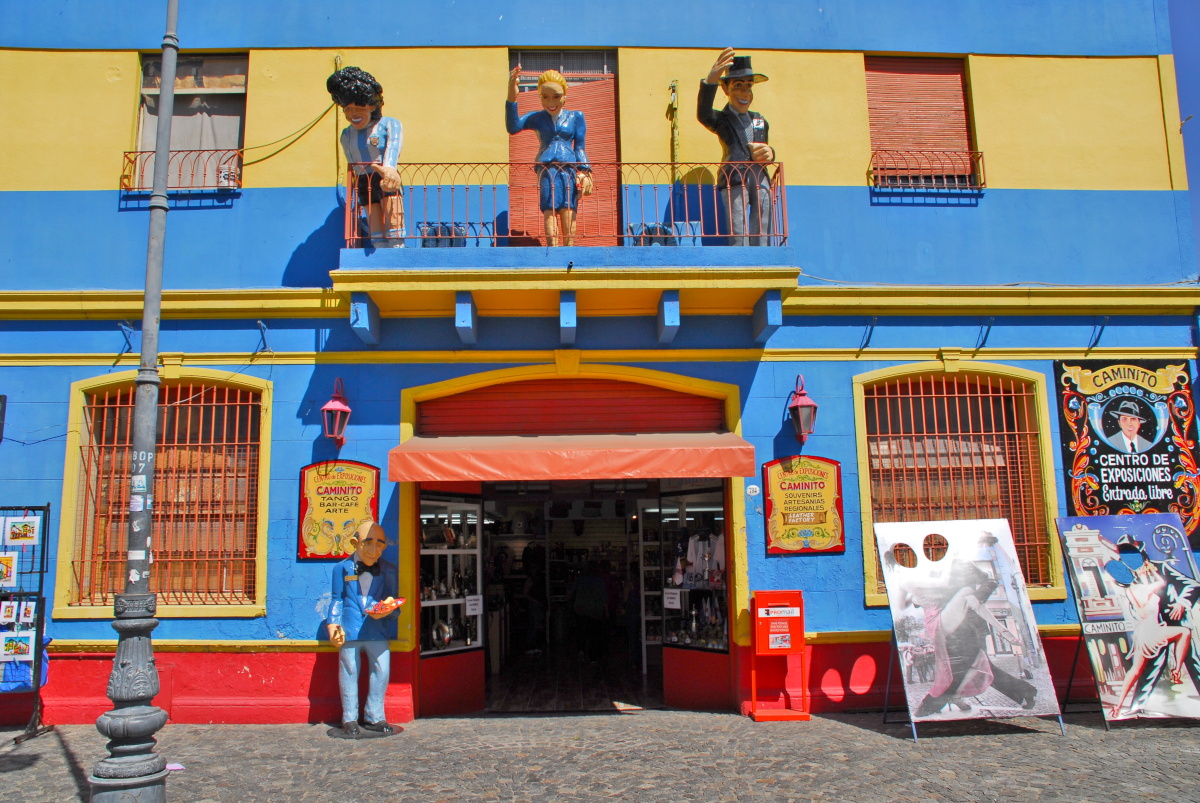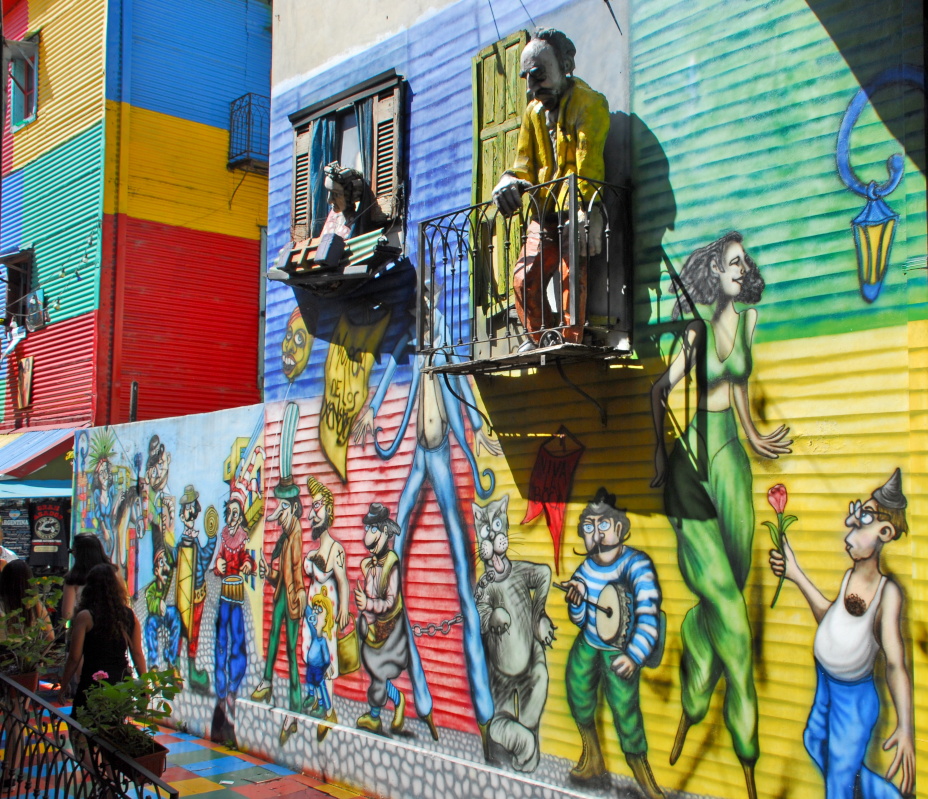Um zwei Uhr Nachmittags sind wir zu einer vierstündigen Stadtrundfahrt und Stadtbesichtigung eingeladen. Insgesamt haben wir auf dieser Tour vier Anlaufpunkte. Der erste Halt findet am Hauptplatz vor der Kathedrale und dem Regierungsgebäude mit dem Reiterdenkmal statt. Nach einem kurzen Aufenthalt geht es weiter in das ehemalige Hafengebiet, das Stadtviertel La Boca mit seinen vielen originellen, kleinen und bunten Häusern. La Boca entstand Ende des 19. Jahrhunderts als Viertel italienischer Einwanderer, die meist als Industriearbeiter tätig waren. Viele der ersten Einwohner stammten aus der italienischen Hafenstadt Genua. Die Häuser wurden aus dem Blech abgewrackter Schiffe gebaut und mit Schiffslack bunt bemalt. Aus deren Fenstern schauen und auf deren Balkonen stehen Leute, diese sind allerdings nur Figuren. Dieses Stadtviertel ist für seine vielen Tangotänzer auf den Straßen berühmt.