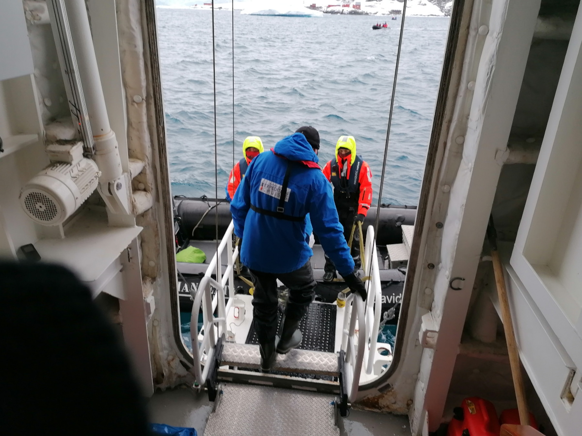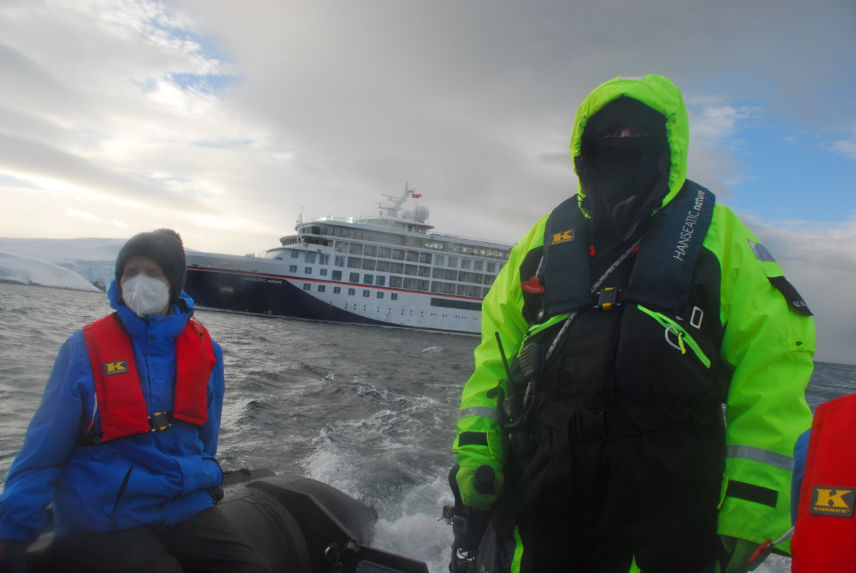 Schließlich werden die Anker gelassen. Wir befinden uns nun auf 64° 19' 7" südlicher Breite und 62° 58' 32" westlicher Länge. Die Seitenluke wird geöffnet und zehn Zodiacs zu Wasser gelassen. Unser erstes großes Abenteuer in der Antarktis beginnt mit unserem ersten Zodiac-Ausflug. Wir sind gut ausgerüstet und vollständig eingepackt. Dabei sehen wir, wie die anderen Gäste auch, aus wie kleine blaue Michelin-Männchen. Wir tragen: