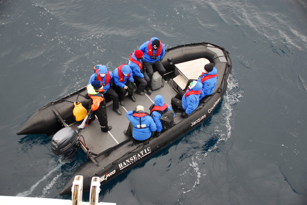 Unser Schiff beherbergt auf dieser Expedition 110 von maximal 199 Gästen und hat 158 Besatzungsmitglieder. Die Gäste sind in zwei Gruppen zu je fünf Farben eingeteilt, die die Ausflüge nacheinander machen. Wir gehören der Farbe Weiß an. Acht Gäste nimmt jedes Zodiac auf. Diesmal ist es keine Anlandung, sondern nur eine Rundfahrt. Dank der Hilfe der Mitarbeiter ist das Besteigen der Zodiacs kein Problem. Wir sitzen auf der Außenwand aus Gummi nur wenige Zentimeter über der Wasseroberfläche. Mit der Hand könnten wir das eiskalte Wasser berühren.